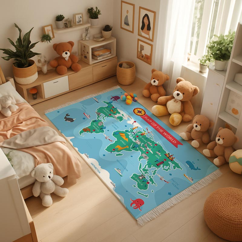فرشینه نقشه جهان، انتخابی آموزشی و سرگرم‌کننده برای اتاق کودک است که محیطی پویا و جذاب برای یادگیری و بازی فراهم می‌کند. این محصول با طراحی دقیق و رنگارنگ شامل نقشه جهان، قاره‌ها، کشورها و حیوانات بومی هر منطقه، کودکان را با جغرافیا و مفاهیم پایه جهان آشنا می‌سازد. کودک با دیدن این نقشه می‌تواند با نام قاره‌ها، کشورها و ویژگی‌های طبیعی آشنا شود و در عین حال، تجربه‌ای سرگرم‌کننده و تعاملی داشته باشد.